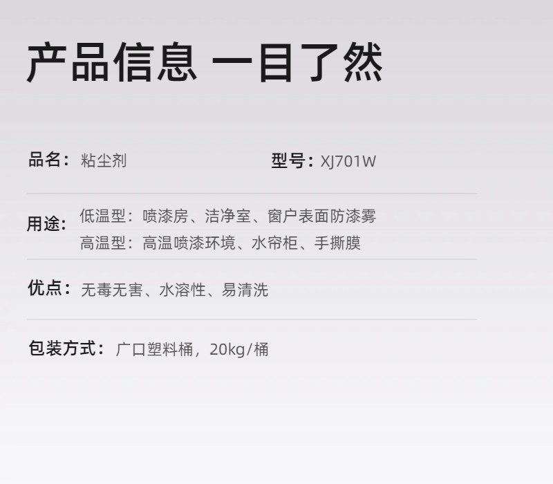 粘尘剂是一种专用于捕获并固定悬浮颗粒(如漆雾、粉尘、微粒)的功能性液体涂层,广泛应用于喷漆房、洁净车间、印刷及医药生产等对空气洁净度要求高的场景。其核心价值在于替代传统频繁清洁或高能耗过滤设备,实现低成本、高效率的源头抑尘。