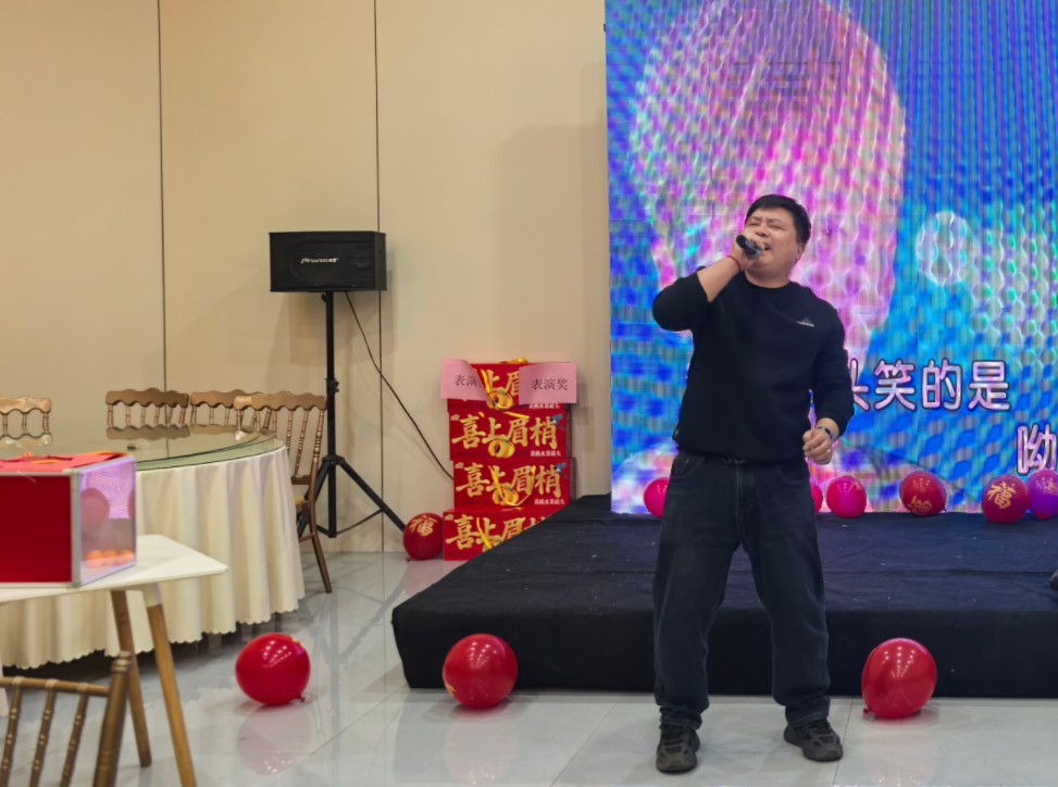 年会现场的文艺环节堪称 “卧虎藏龙”!董事长许金桓先生率先登台,带头一展歌喉,一首充满正能量的经典歌曲瞬间点燃全场气氛。董事长饱含深情的演唱,既展现了领袖风采,更传递了对全体员工的殷切期许与新春祝福,台下员工们挥舞着荧光棒,跟着节奏齐声合唱,掌声与欢呼声经久不息。